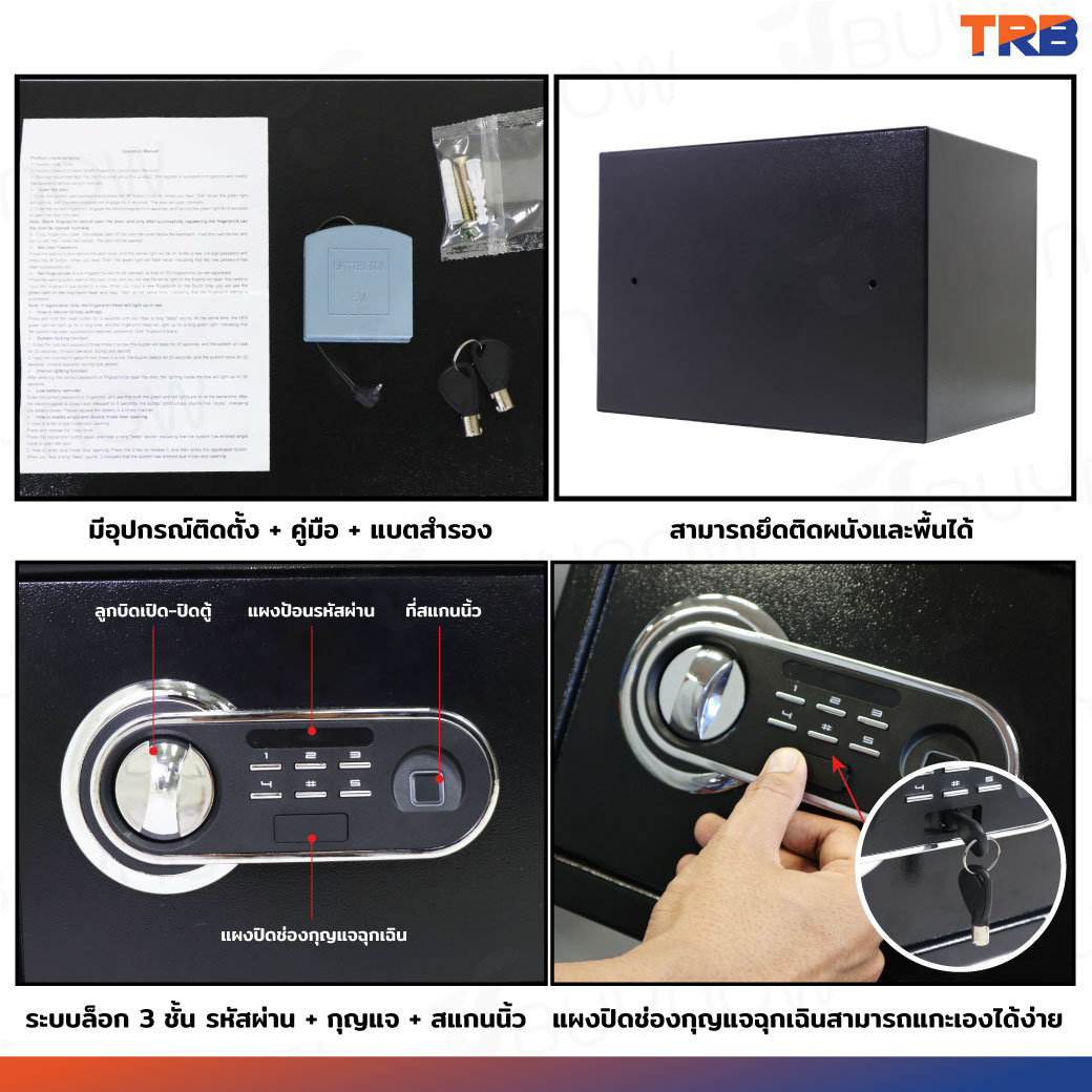 - ล็อค 3 ระบบ คือสแกนนิ้ว+รหัสผ่าน+กุญแจ