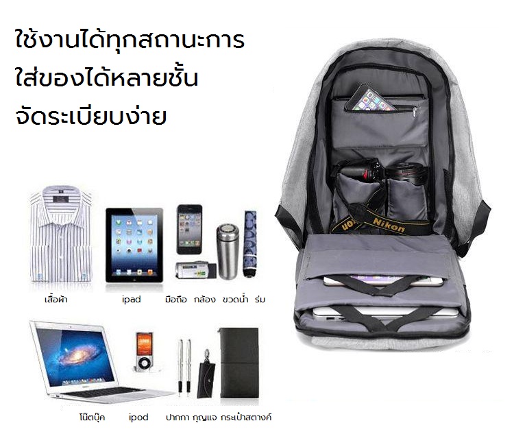 - พร้อมพอร์ตชาร์จ USB เพื่อการชาร์จแบตเตอรีของอุปกรณ์ต่างๆ โดยไม่ต้องนำออกมาจากเป้