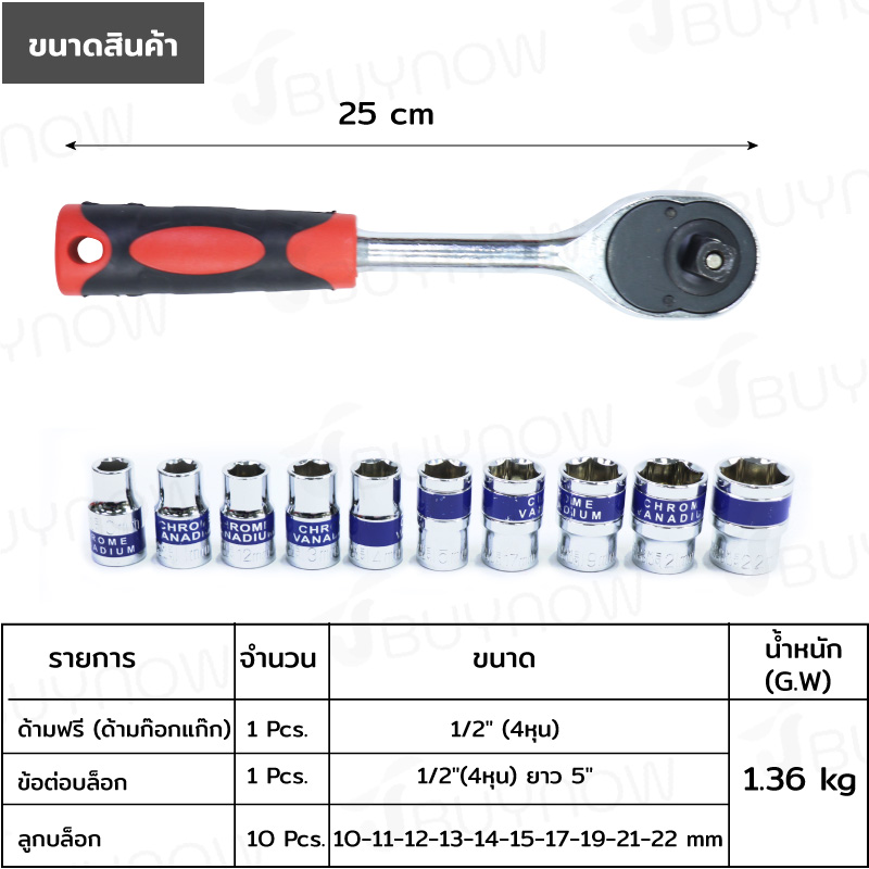 - ชุดบล็อก 12 ชิ้น 1/2 (4หุน) 10-22mm