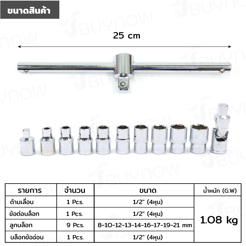 - 9×ลูกบล็อก1/2 เบอร์ 8,10,12,13,14,16,17,19,21 mm