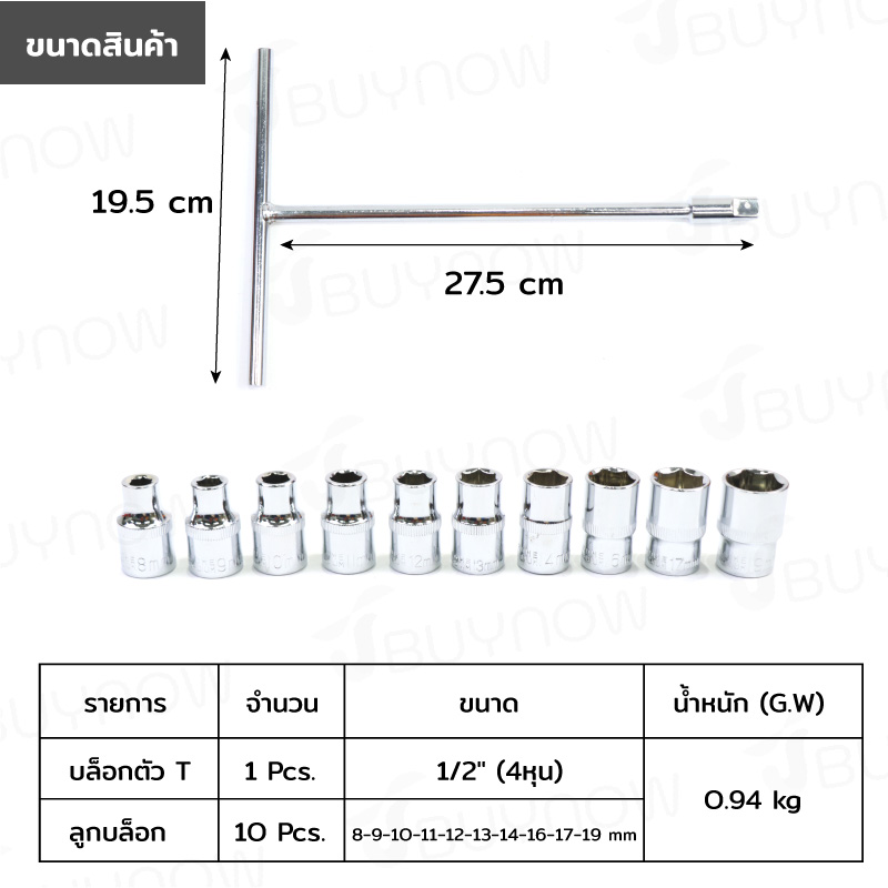 - ชุดบล็อกด้ามT 11 ชิ้น 1/2 (4หุน) 8-19mm