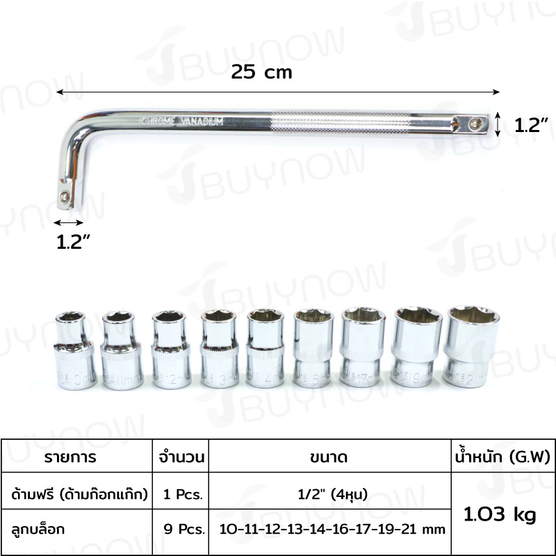 - 9×ลูกบล็อกเบอร์ 10,11,12,13,14,16,17,19,21 mm