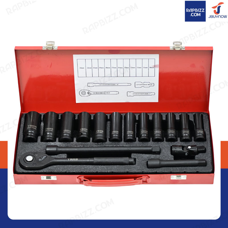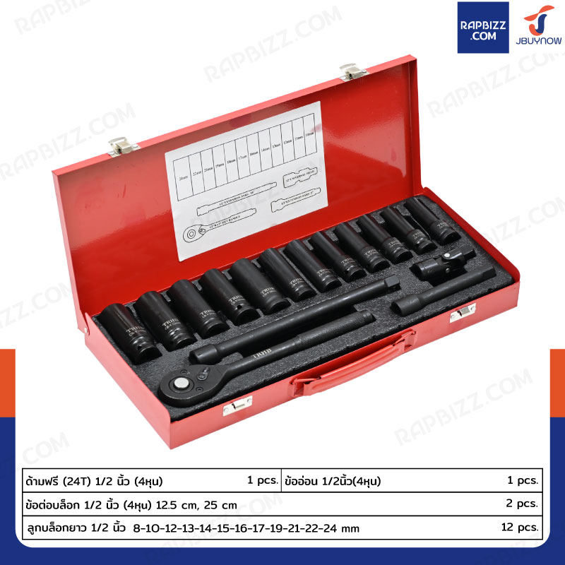 - ชุดบล็อกยาว 16 ชิ้น 1/2 (4หุน) 8-24mm เหล็กดำ