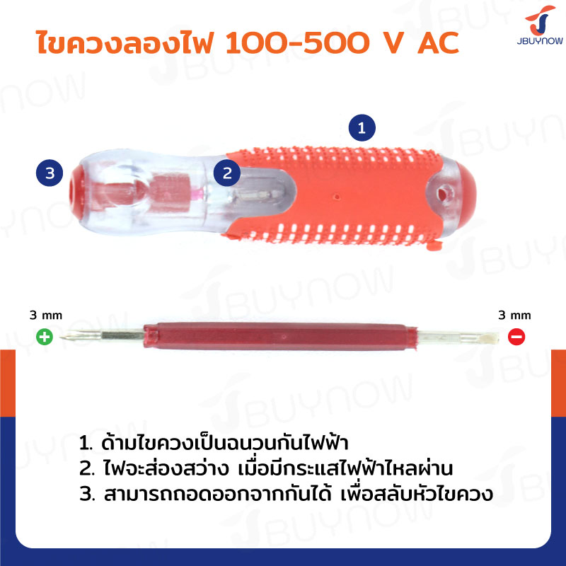 - ไขควงลองไฟ 100-500V AC สลับหัวได้: 3mm