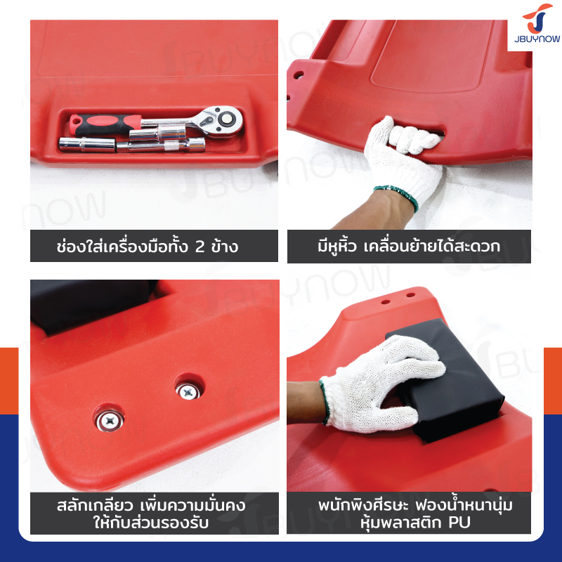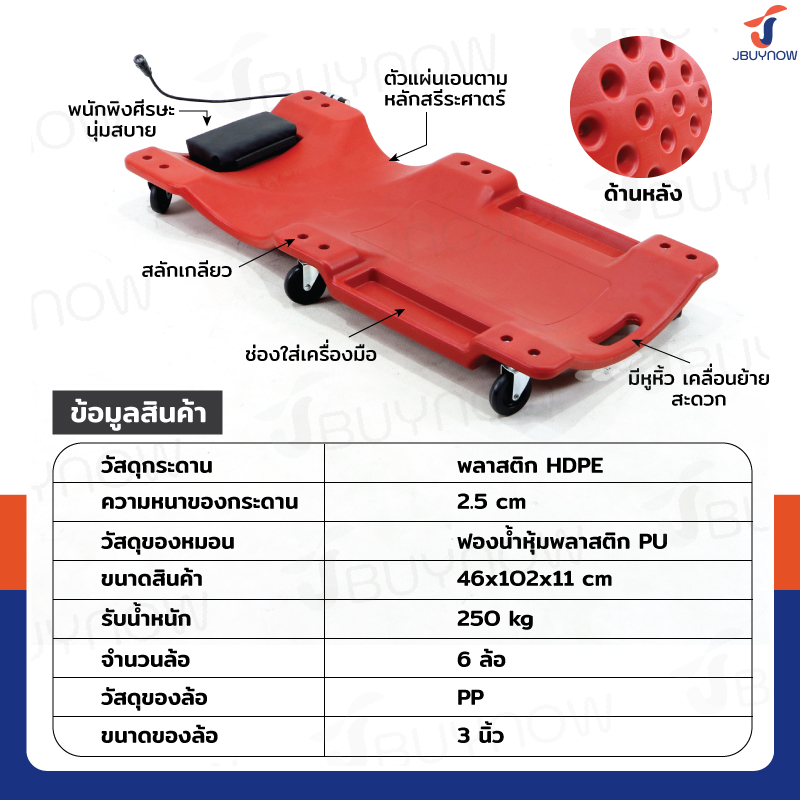 - เหมาะสำหรับใช้รองนอนเมื่อต้องทำงานซ่อมแซม งานซ่อมบำรุงรถยนต์ เครื่องจักรต่าง ๆ ที่ต้องการพื้นที่เข้าถึงใต้เครื่อง