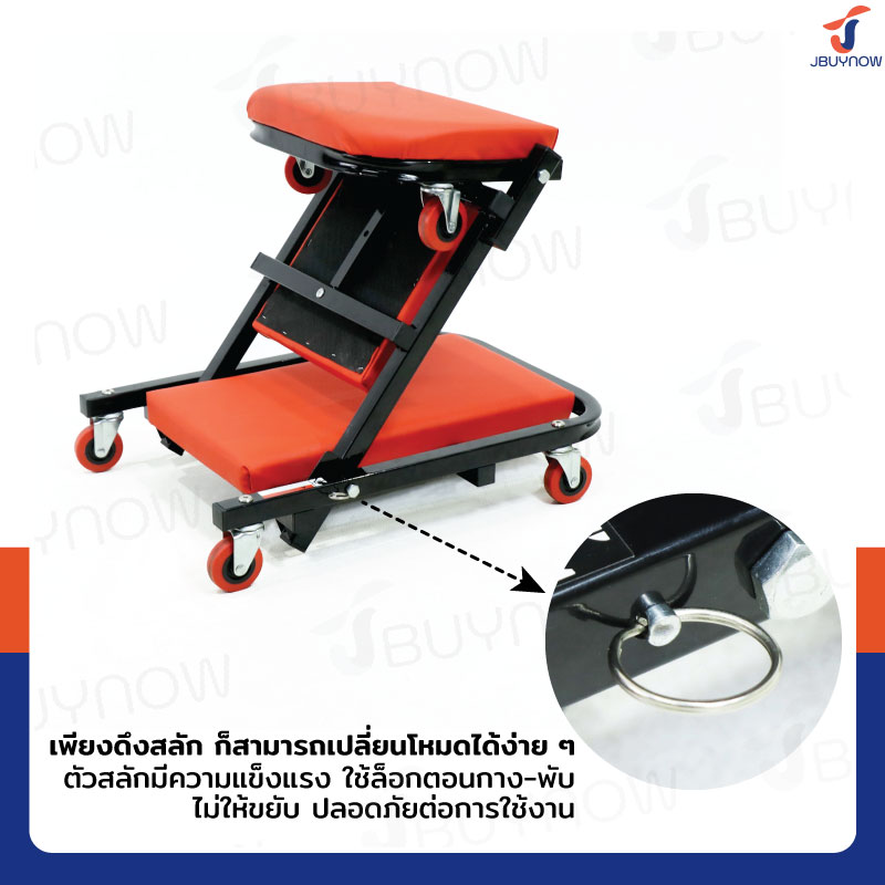 - เพียงดึงสลัก ก็สามารถเปลี่ยนโหมดได้ง่าย ๆ ปรับเป็นเก้าอี้ซ่อมรถหรือกระดานนอนซ่อมรถอเนกประสงค์