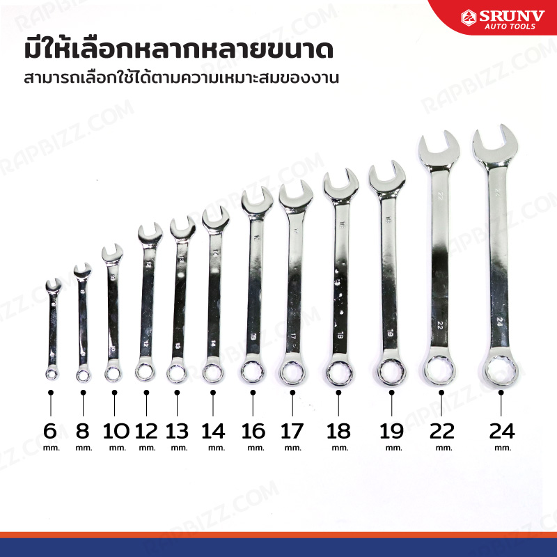 - ในชุดประกอบด้วยประแจเบอร์ 6,8,10,12,13,14,16,17,18,19,22,24 mm