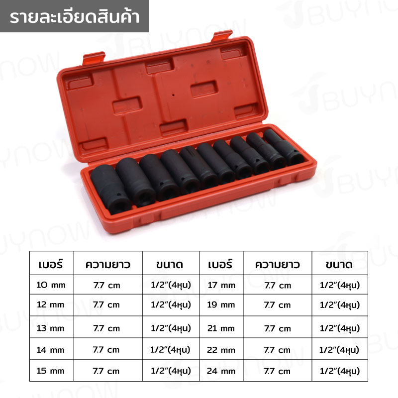- 10×ลูกบล็อกลมยาว 1/2 เบอร์ 10-12-13-14-15-17-19-21-22-24 mm
