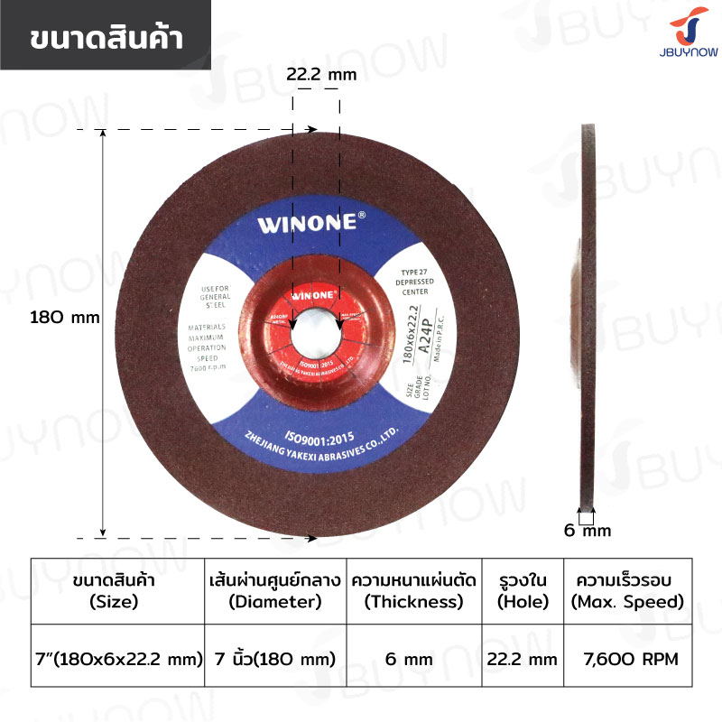 - ขนาดใบเจียร: 180x6x22.2 mm