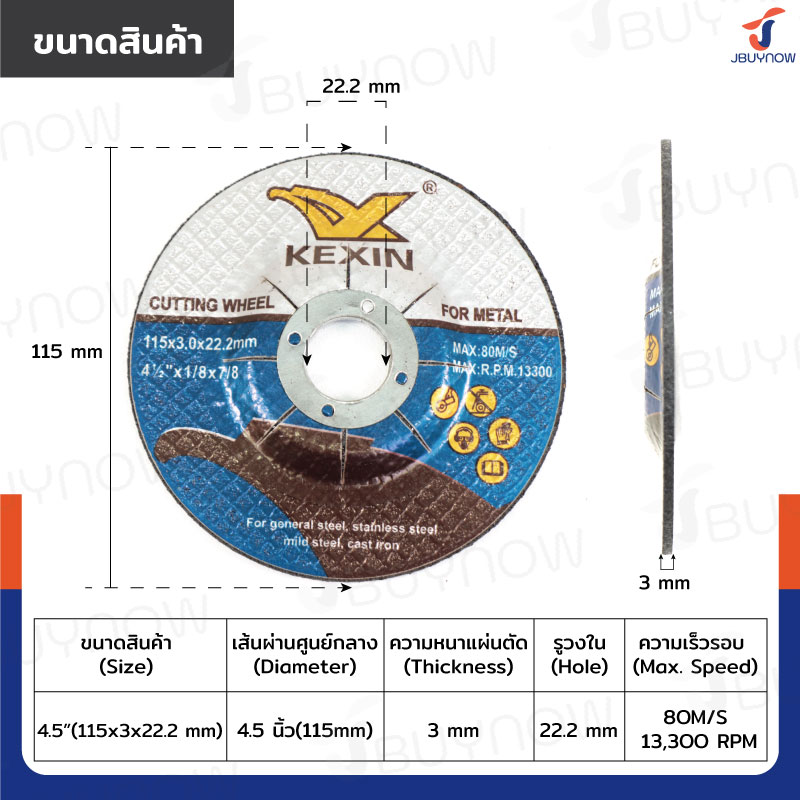ใบตัดเหล็ก (แบบนูน) 4.5 นิ้ว หนา 3 mm 115x3x22.2 mm JBUYNOW TG-029/PACK