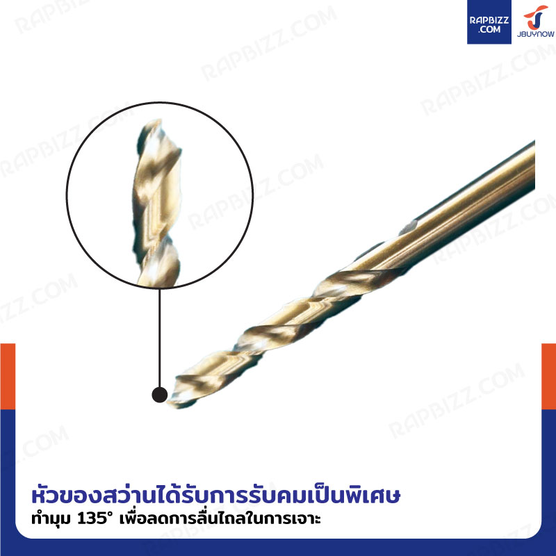 - ส่วนหัวดอกสว่านได้รับการรับคมเป็นพิเศษทำมุม 135 องศา เพื่อลดการลื่นไถลของการเจาะ
