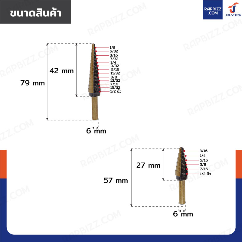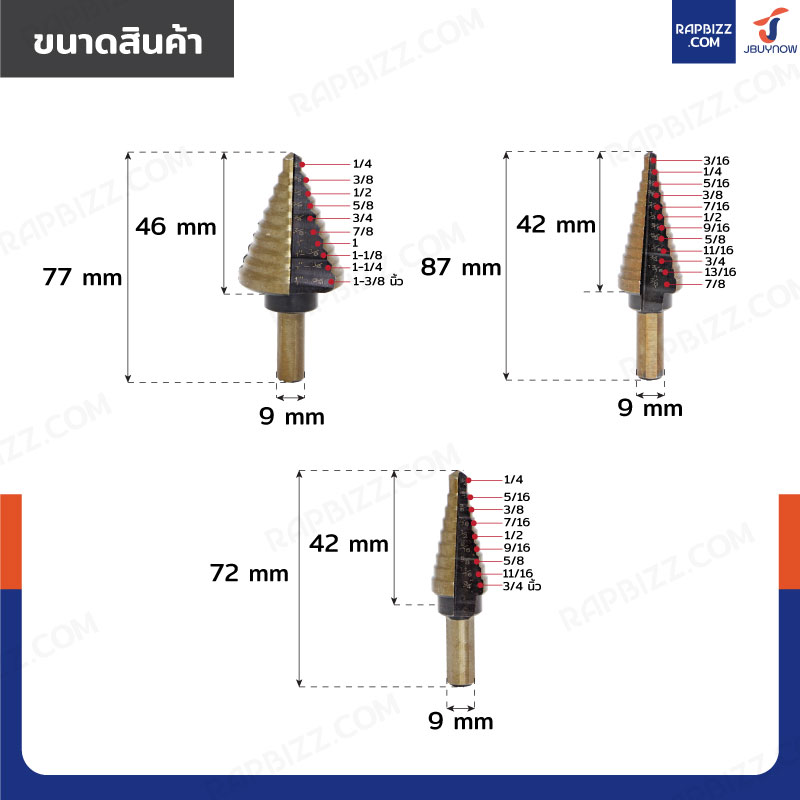 ขนาดดอกสว่านทรงเจดีย์ 5 เบอร์