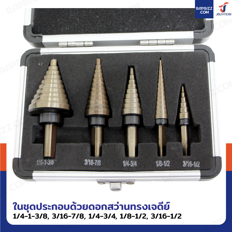 ดอกสว่านเจดีย์ 5 ชิ้น คว้านรู เจาะขยายรู ชุบไทเทเนียม กล่องอลูมิเนียม