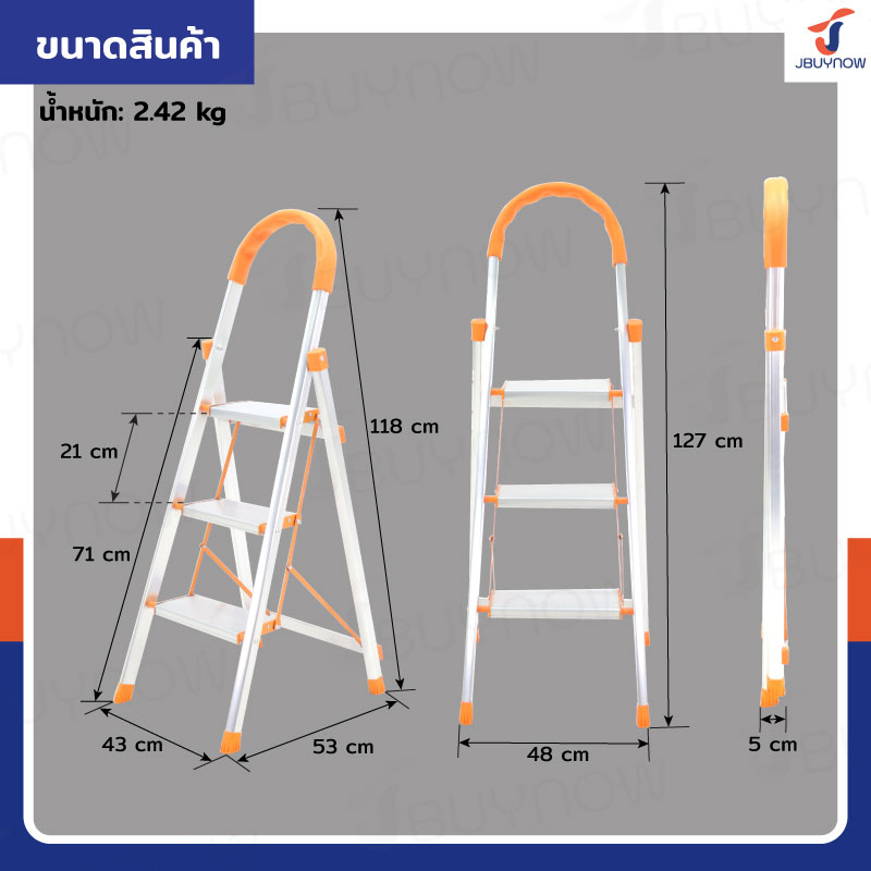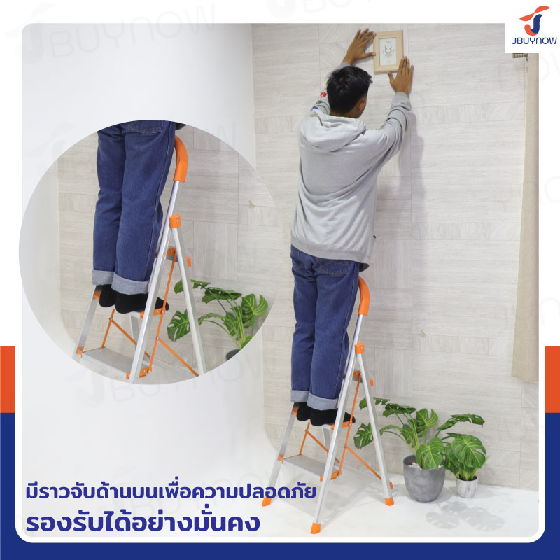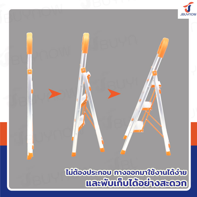 บันไดอลูมิเนียมพับเก็บได้ 3 ขั้น มีราวจับ รับน้ำหนักได้ 150 kg สีส้ม JBUYNOW DLB-3