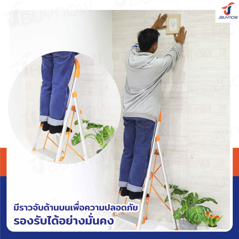 บันไดอลูมิเนียมพับเก็บได้ 3 ขั้น มีราวจับ รับน้ำหนักได้ 150 kg สีส้ม JBUYNOW DLB-3