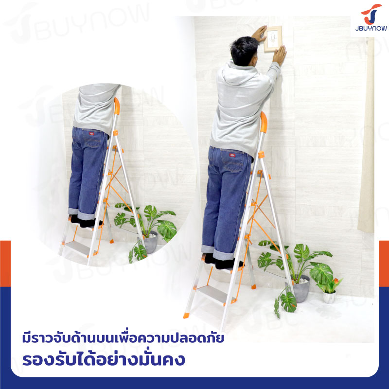 บันไดอลูมิเนียมพับเก็บได้ 3 ขั้น มีราวจับ รับน้ำหนักได้ 150 kg สีส้ม JBUYNOW DLB-3