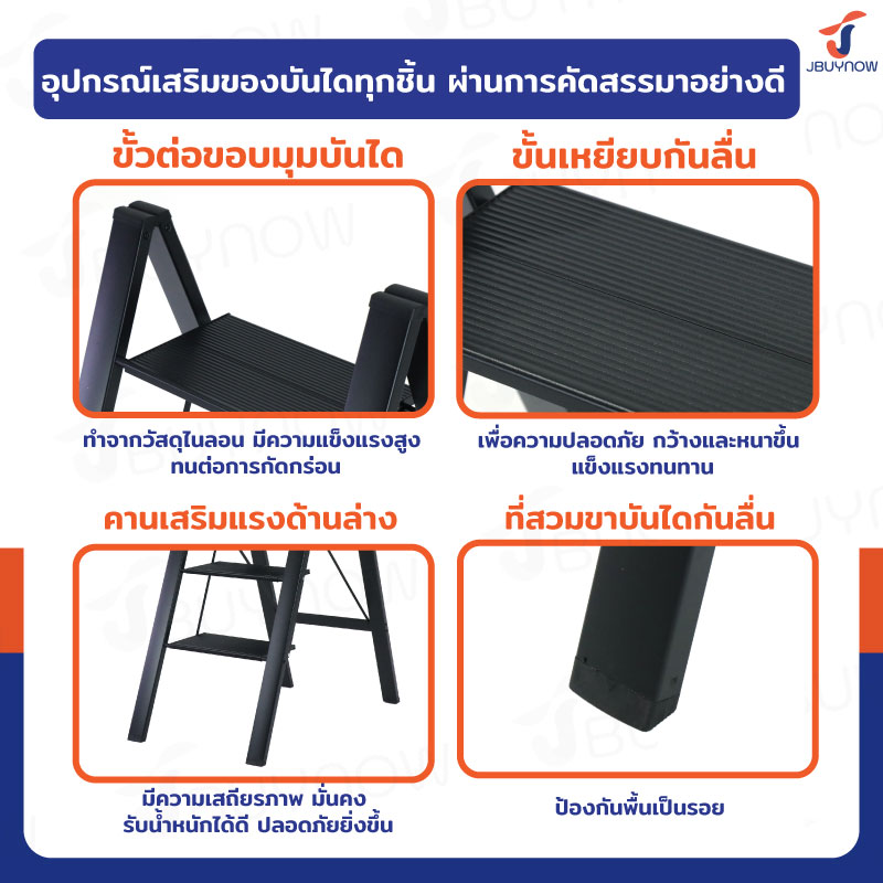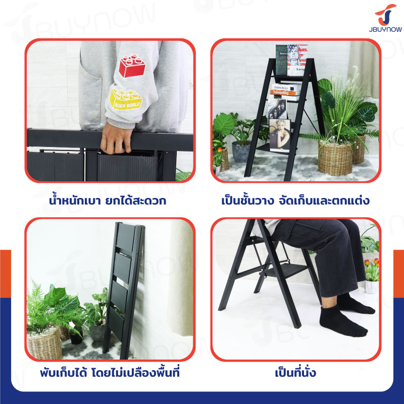 บันไดอลูมิเนียม 3 ขั้น แบบพกพา สไตล์มินิมอล สีดำ JBUYNOW HJ-3B