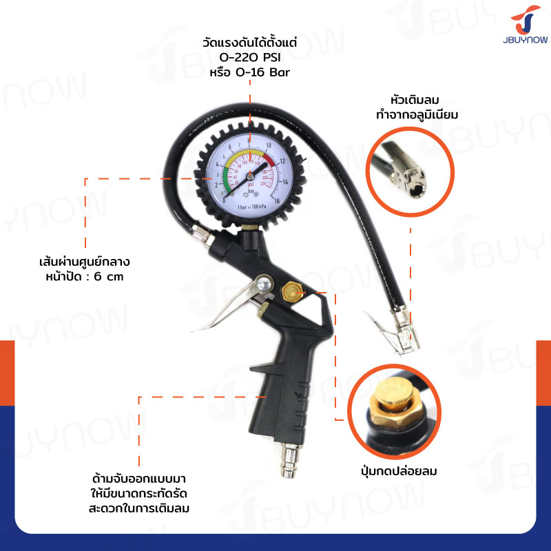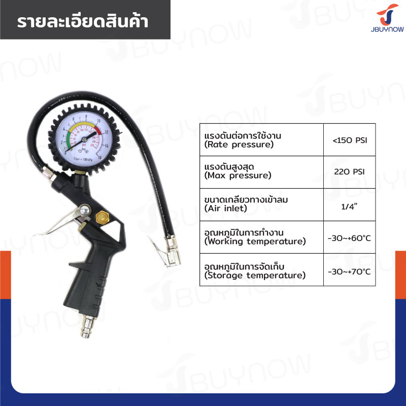 - วัดแรงดันได้ตั้งแต่ 0-220 PSI หรือ 0-16 Bar