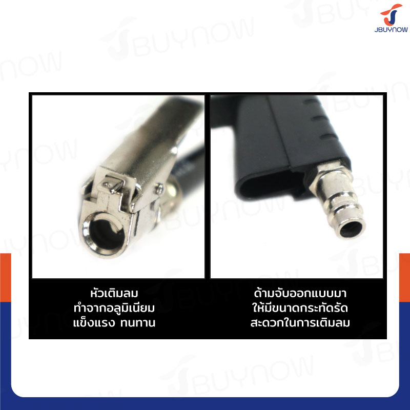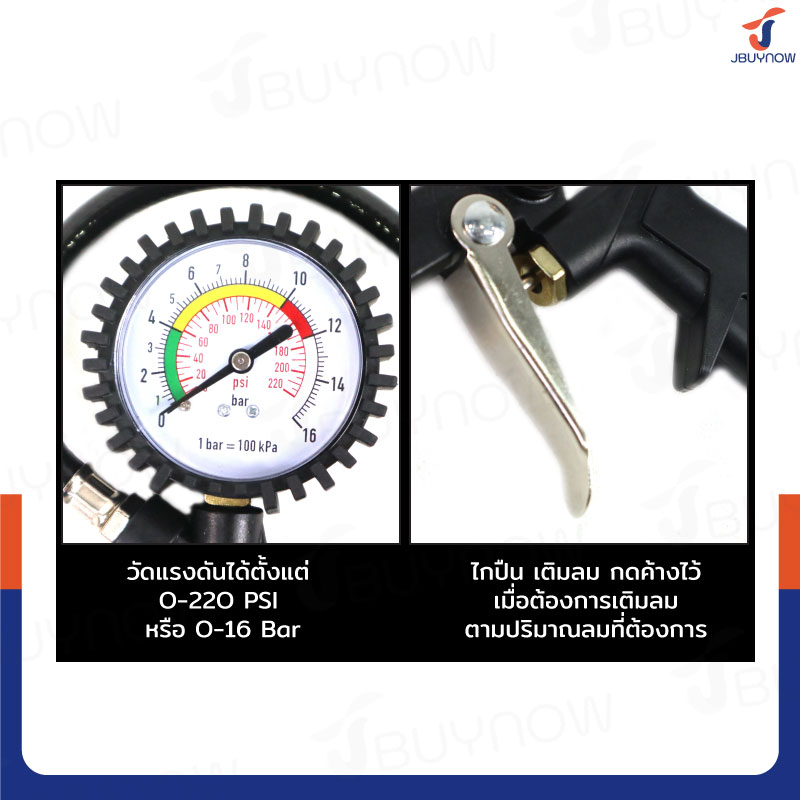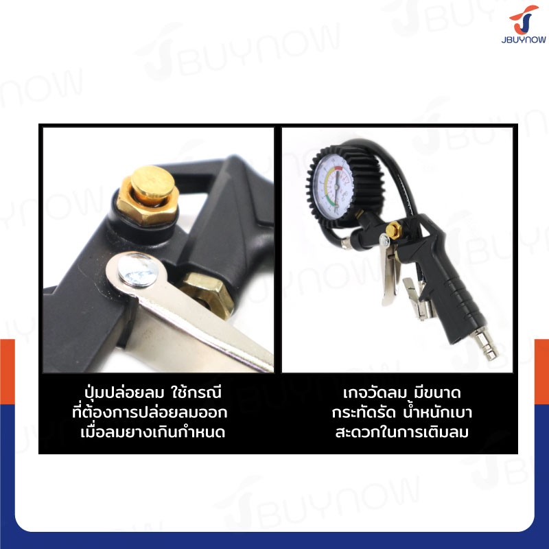 - ตัวเติมลมยาง มีรูปทรงปืน ขนาดกระทัดรัด สะดวกในการเติมลม ด้ามจับดีไซน์มาเพื่อจับให้กระชับมือ