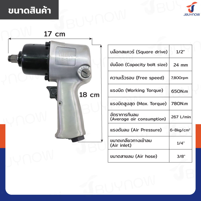 - ขนาดสายลม (Air hose): 3/8