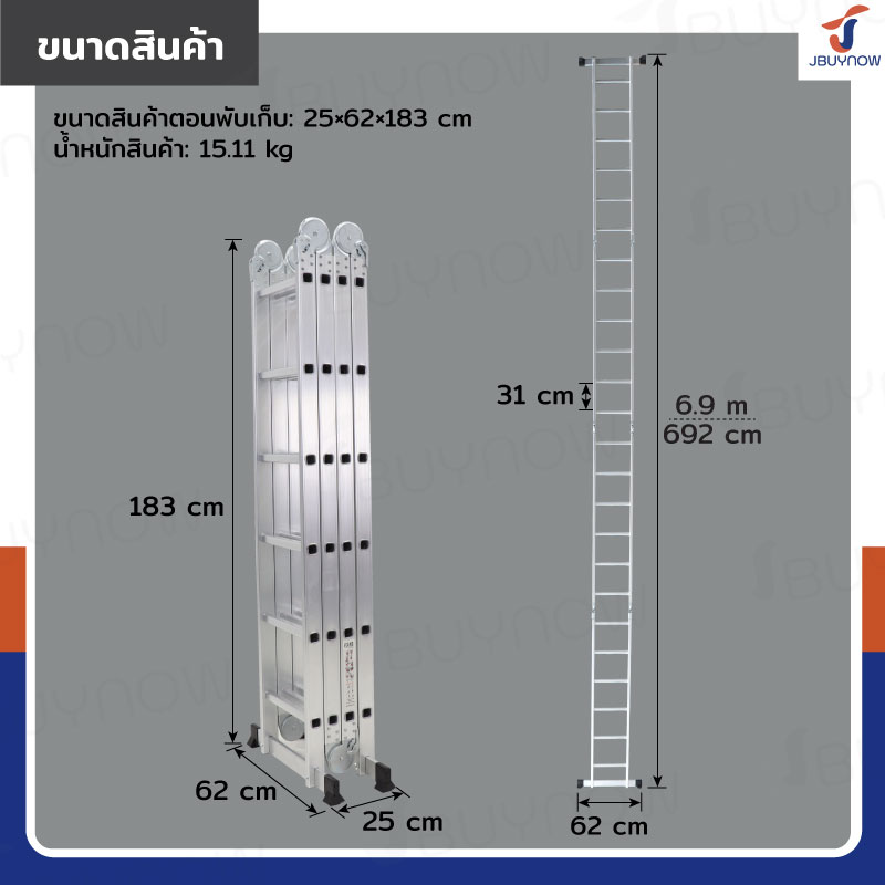 บันไดพับได้ อลูมิเนียมแท้ทั้งตัว 24 ขั้น 6.9M ข้อใหญ่ BGJ4X6