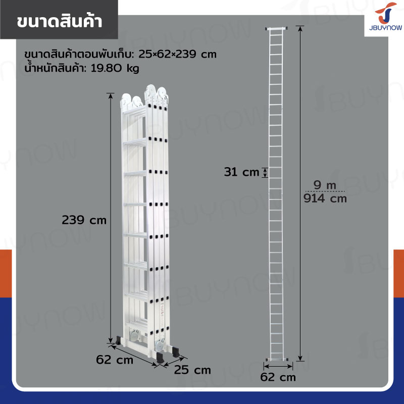 บันไดพับได้ อลูมิเนียมแท้ทั้งตัว 32 ขั้น 9M ข้อใหญ่ BGJ4X8