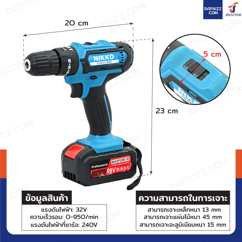 Nikko สว่านไร้สาย 32V พร้อมแบตเตอรี่และอุปกรณ์เสริม NK-456