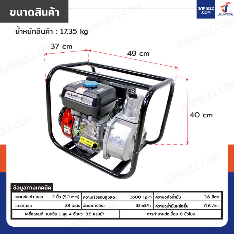 เครื่องสูบน้ำ 2 นิ้ว 8.5แรงม้า ปั๊มใหม่ แรงดันสูง 4 จังหวะ สตาร์ทง่าย ปั๊มชนเครื่อง เบนซิน