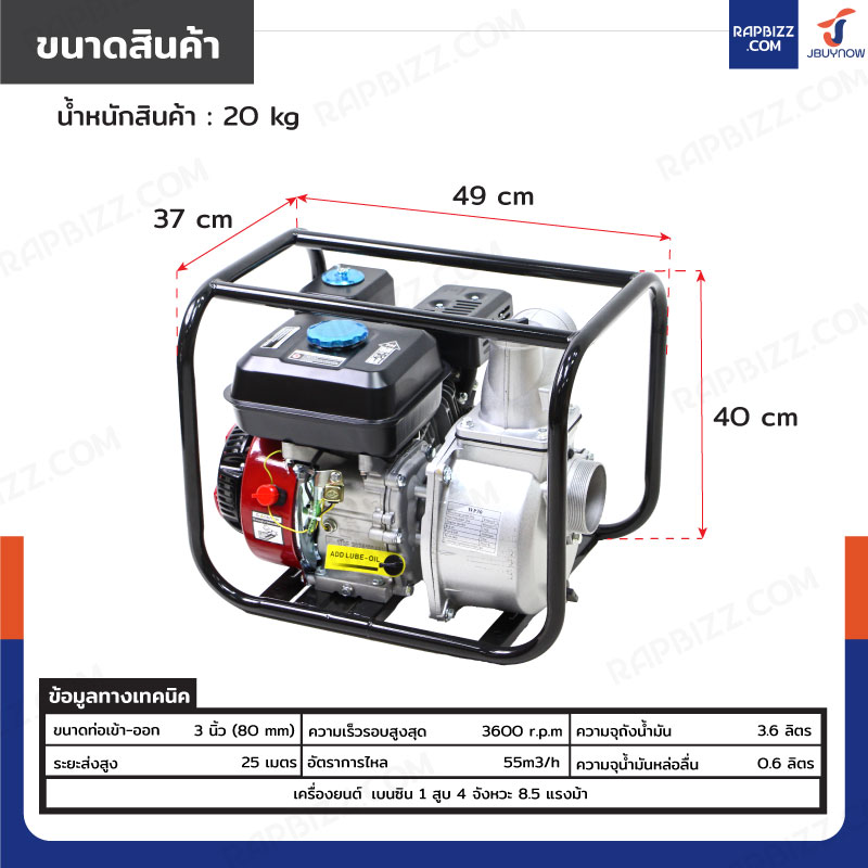 เครื่องสูบน้ำ 3 นิ้ว 8.5แรงม้า ปั๊มใหม่ แรงดันสูง 4 จังหวะ สตาร์ทง่าย ปั๊มชนเครื่อง เบนซิน