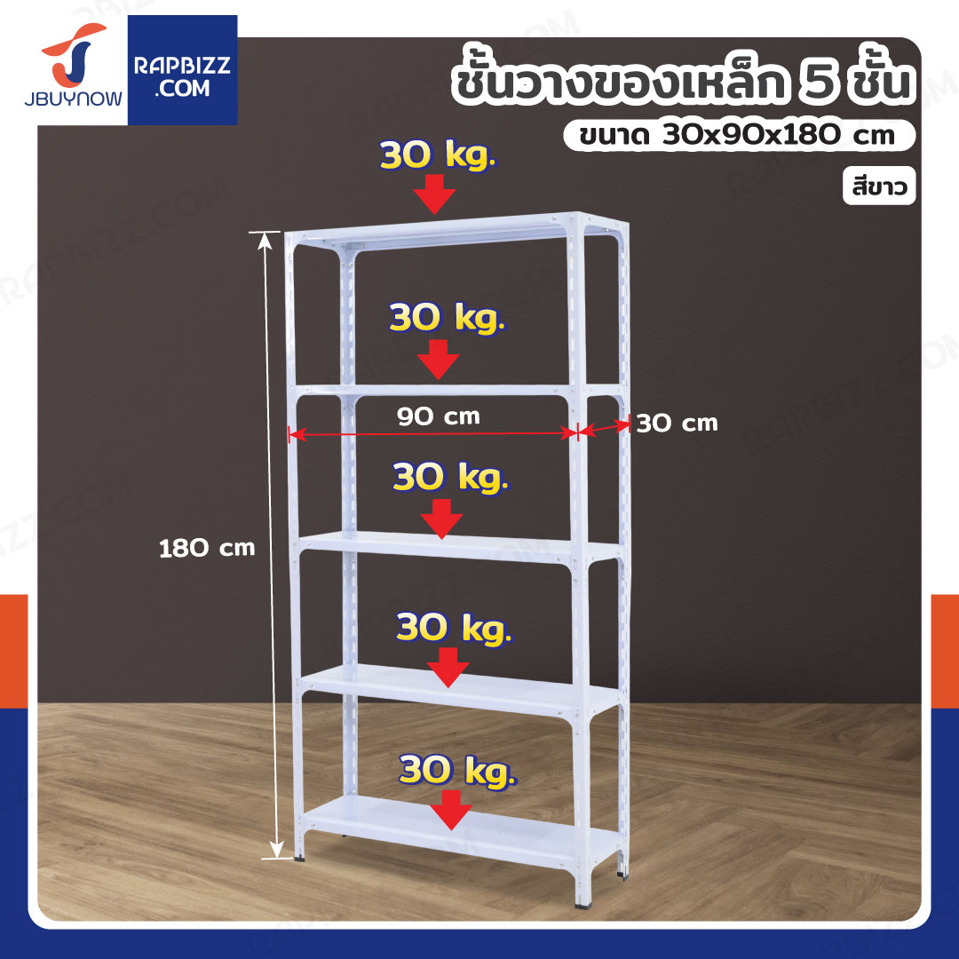 ชั้นวางของเหล็ก 5 ชั้น ชั้นวางอเนกประสงค์ 30x90x180 cm สีขาว