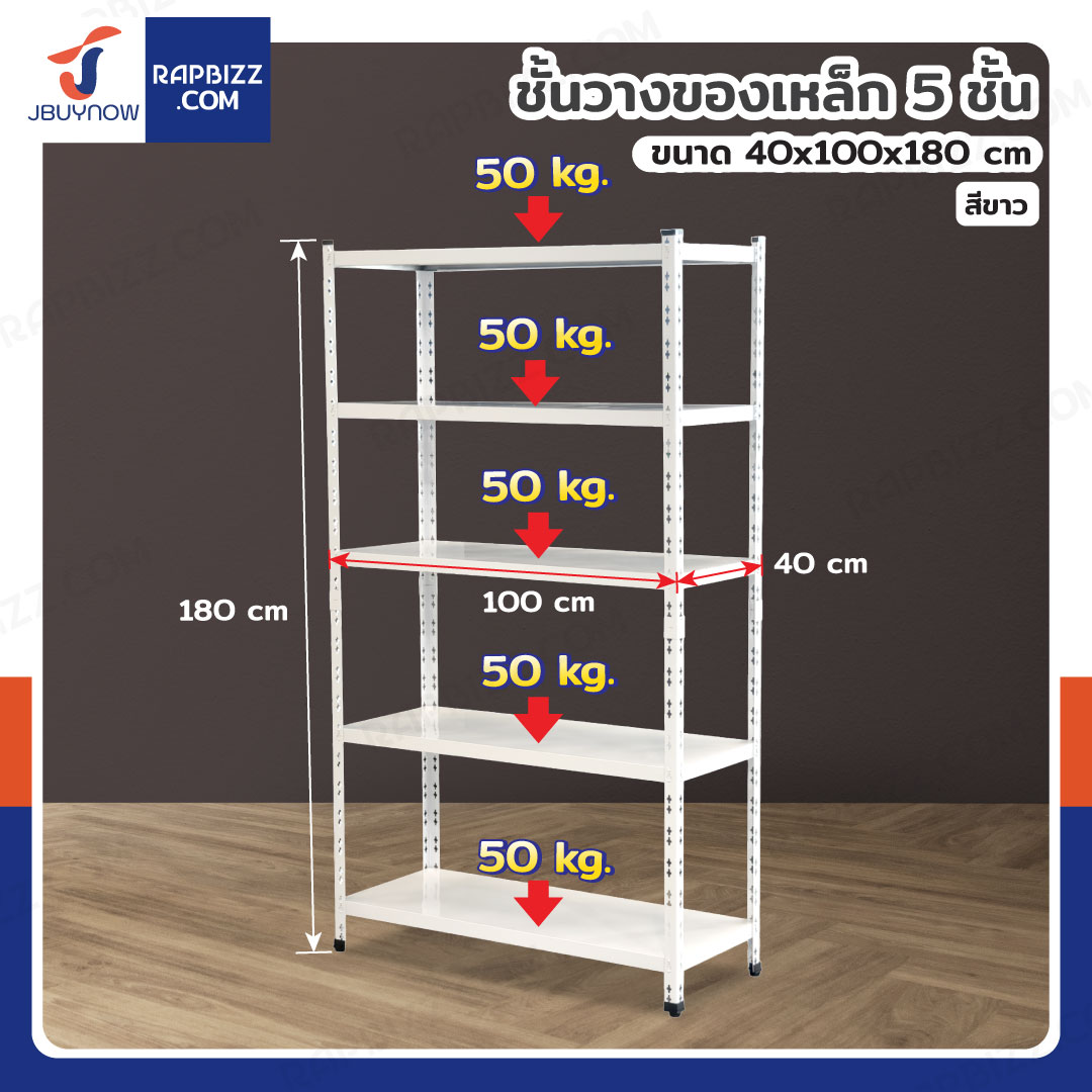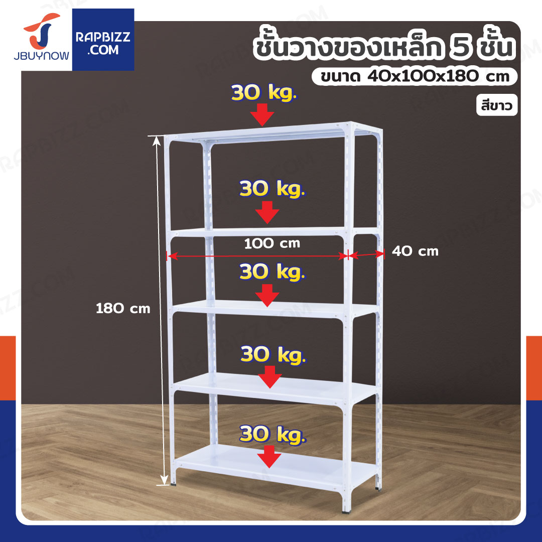 ชั้นวางของเหล็ก 5 ชั้น ชั้นวางอเนกประสงค์ 40x100x180 cm สีขาว ไม่ใช้สกรู
