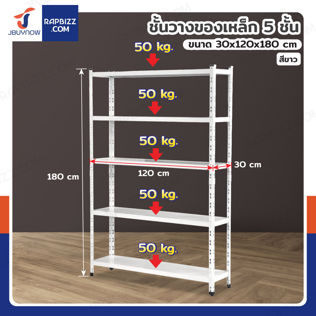 ชั้นวางของเหล็ก 5 ชั้น ชั้นวางอเนกประสงค์ 30x120x180 cm สีขาว ไม่ใช้สกรู