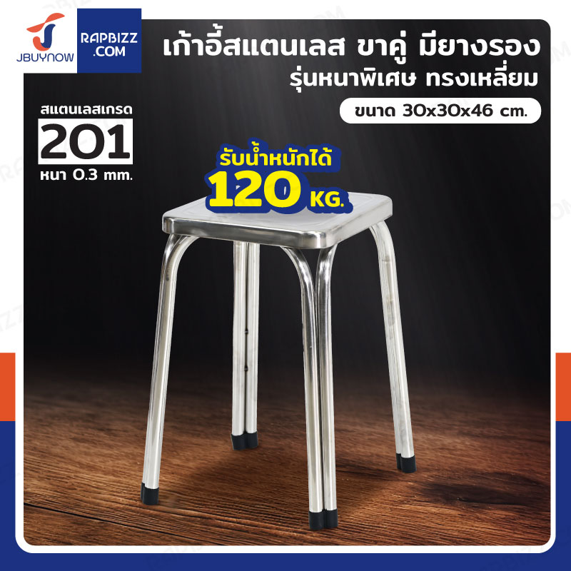เก้าอี้สแตนเลส 201 ขาคู่ มียางรอง รุ่นหนาพิเศษ ทรงเหลี่ยม 30x30x46 cm