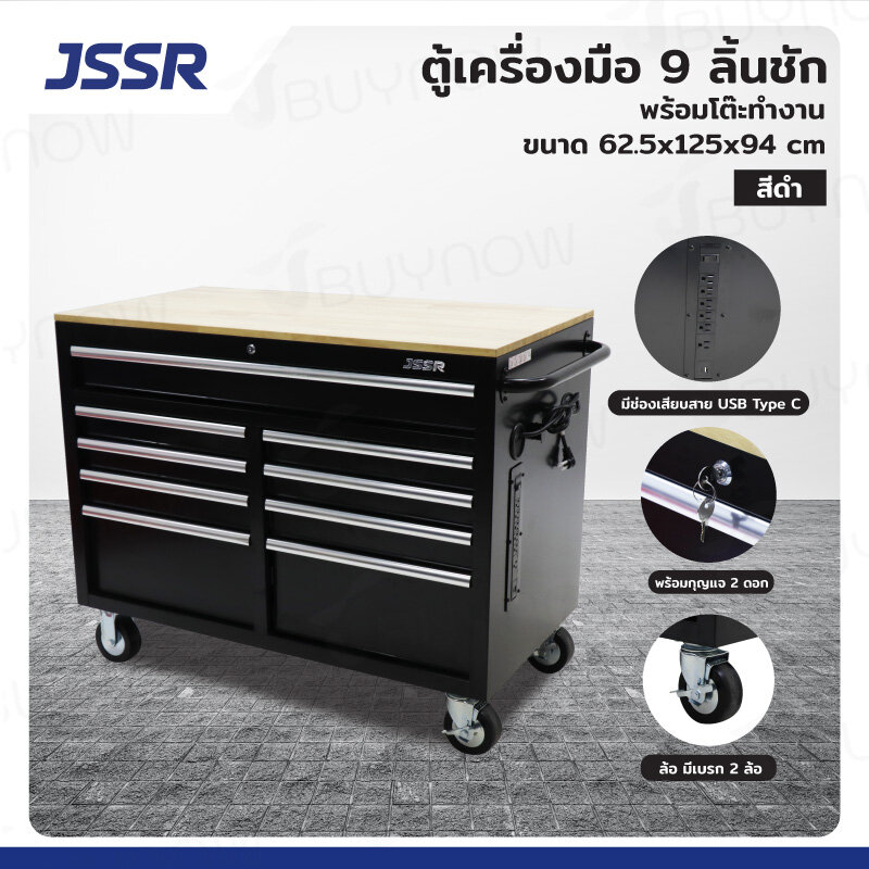 ตู้เครื่องมือ 9 ลิ้นชัก มีกุญแจล็อค พร้อมโต้ะทำงาน 62.5x125x94 ซม. สีดำ TT046