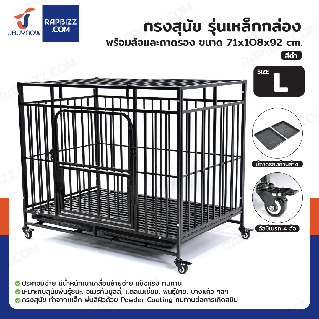 กรงสุนัข กรงสัตว์เลี้ยง รุ่นเหล็กกล่อง พร้อมล้อและถาดรอง Size L 71x108x92 cm สีดำ