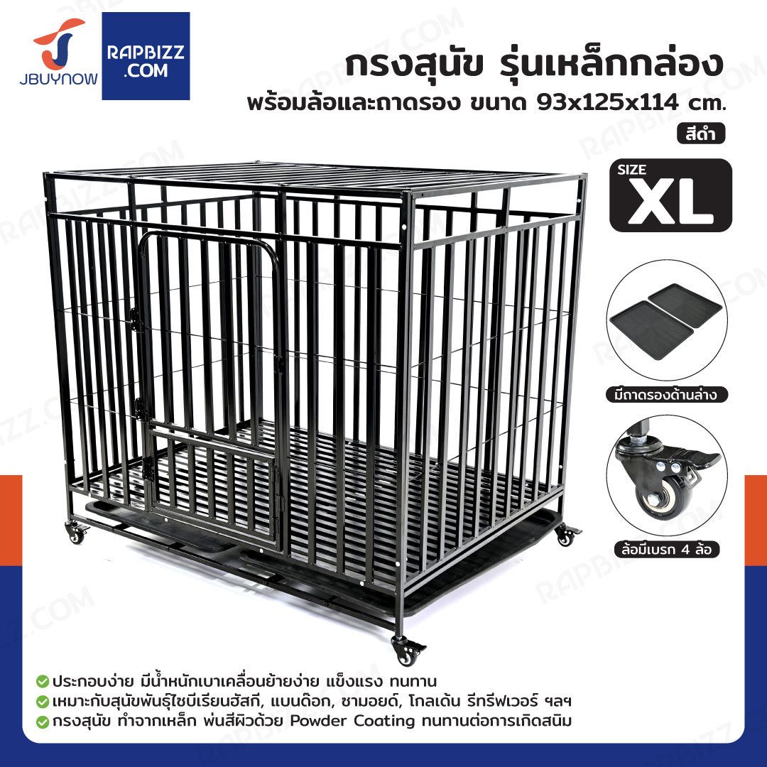 กรงสุนัข กรงสัตว์เลี้ยง รุ่นเหล็กกล่อง พร้อมล้อและถาดรอง Size XL 93x125x114 cm สีดำ