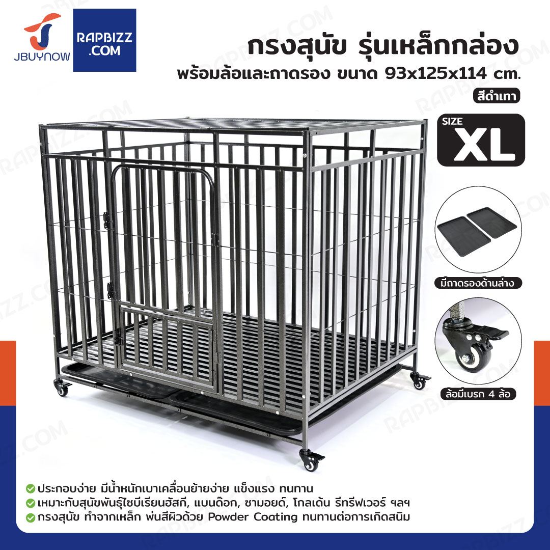 กรงสุนัข กรงสัตว์เลี้ยง รุ่นเหล็กกล่อง พร้อมล้อและถาดรอง Size XL 93x125x114 cm สีดำเทา