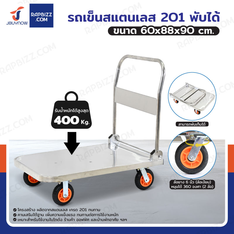 รถเข็นสแตนเลส 201 พับได้ 60x88x90 cm ล้อยาง 6 นิ้ว รับน้ำหนัก 400 KG