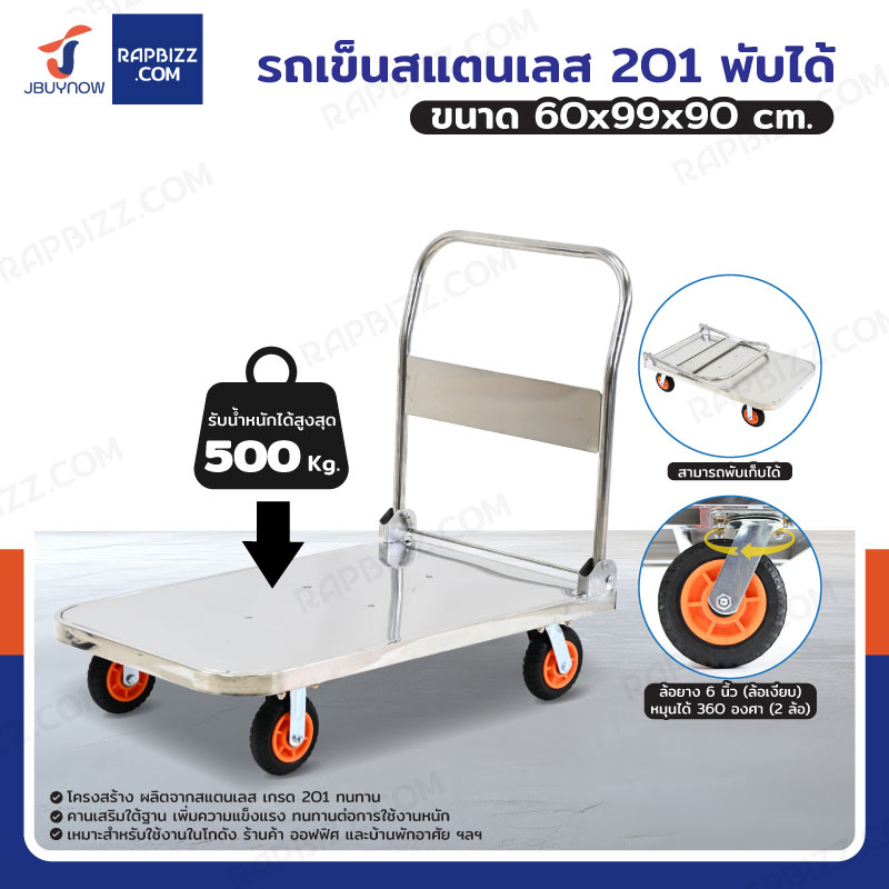 รถเข็นสแตนเลส 201 พับได้ 60x99x90 cm ล้อยาง 6 นิ้ว รับน้ำหนัก 500 KG