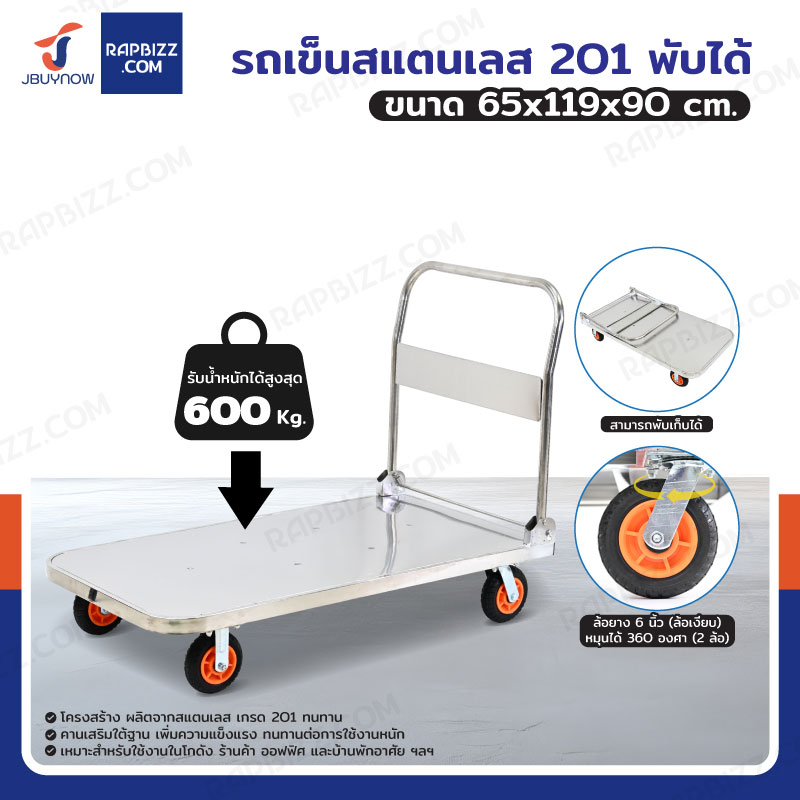 รถเข็นสแตนเลส 201 พับได้ 65x119x90 cm ล้อยาง 6 นิ้ว รับน้ำหนัก 600 KG