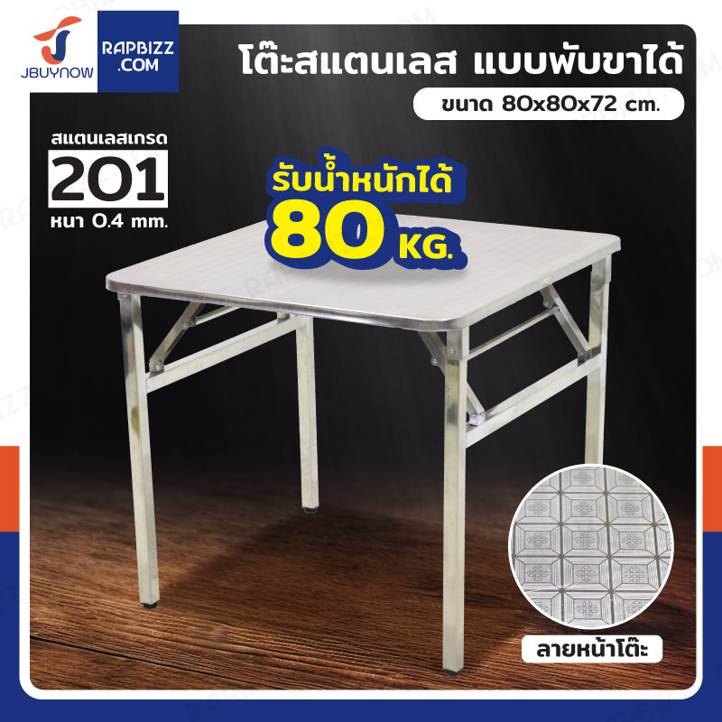 โต๊ะสแตนเลส201 ทรงเหลี่ยม พับขาได้ แบบหน้าโต๊ะมีลาย 80x80x72 cm