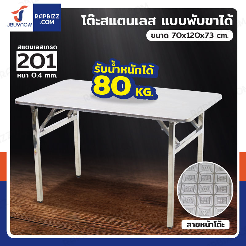 โต๊ะสแตนเลส201 ทรงเหลี่ยม พับขาได้ แบบหน้าโต๊ะมีลาย 70x120x73 cm