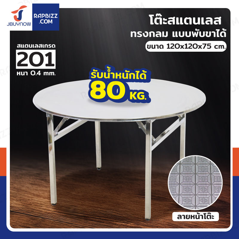 โต๊ะสแตนเลส201 ทรงกลม พับขาได้ แบบหน้าโต๊ะมีลาย 120x120x75 cm