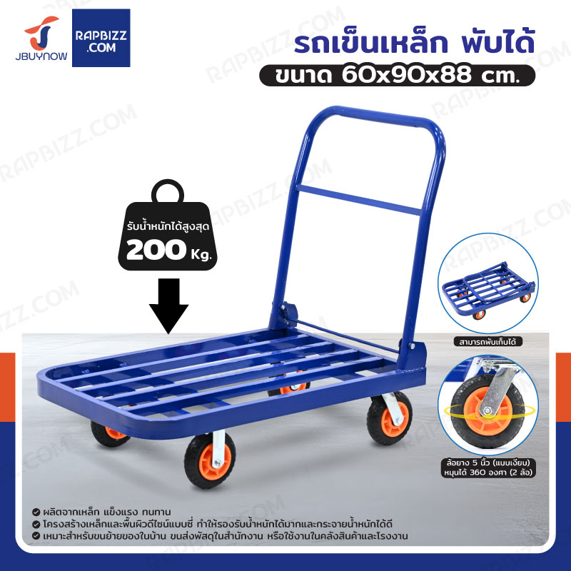 รถเข็นเหล็ก มุมโค้ง พับได้ 60x90x88 CM ล้อยาง 5 นิ้ว รับน้ำหนัก 200 KG