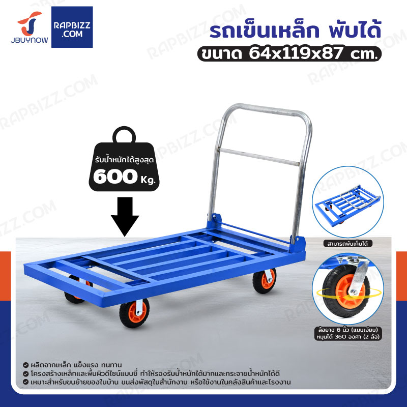 รถเข็นเหล็ก มุมเหลี่ยม พับได้ 64x119x87 CM ล้อยาง 6 นิ้ว รับน้ำหนัก 600 KG