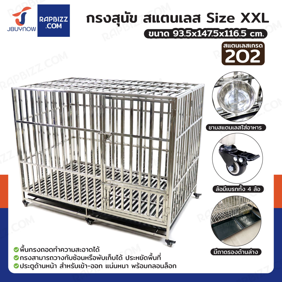 กรงสุนัขสแตนเลส 202 รุ่นท่อเหลี่ยม มีล้อ 1.5 นิ้ว พับได้ Size XXL 93.5x147.5x116.5 cm