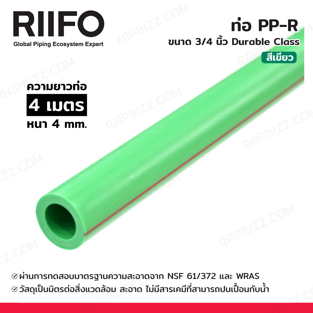 RIIFO ท่อ PP-R ขนาด 3/4 นิ้ว ยาว 4 เมตร สีเขียว DURABLE CLASS 000160005
