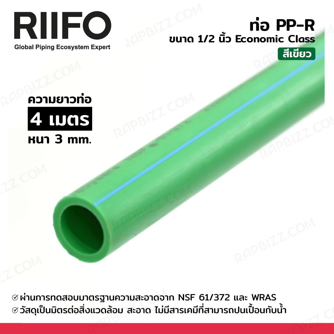 RIIFO ท่อ PP-R ขนาด 1/2 นิ้ว ยาว 4 เมตร สีเขียว ECONOMIC CLASS 000160001