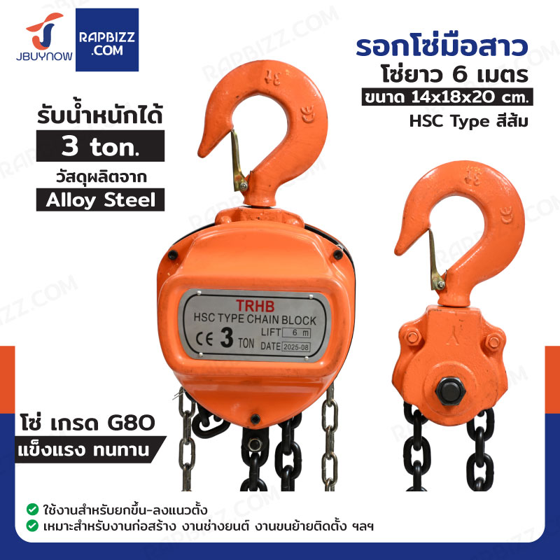 TRHB รอกโซ่มือสาว รอกสามเหลี่ยม 3 ตัน โซ่ยาว 6 เมตร HSC Type สีส้ม