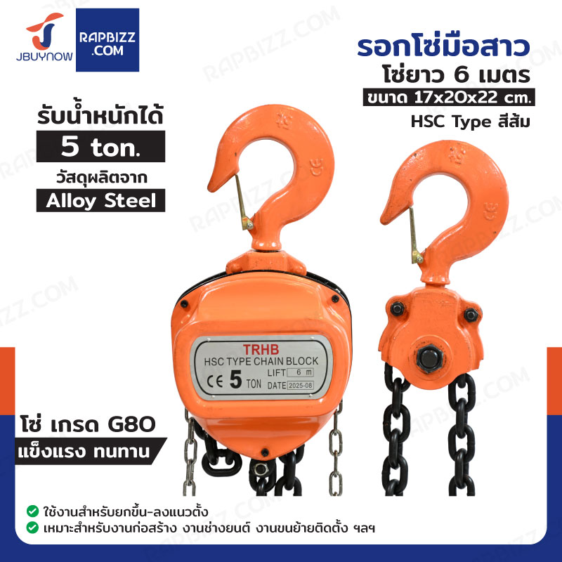 TRHB รอกโซ่มือสาว รอกสามเหลี่ยม 5 ตัน โซ่ยาว 6 เมตร HSC Type สีส้ม